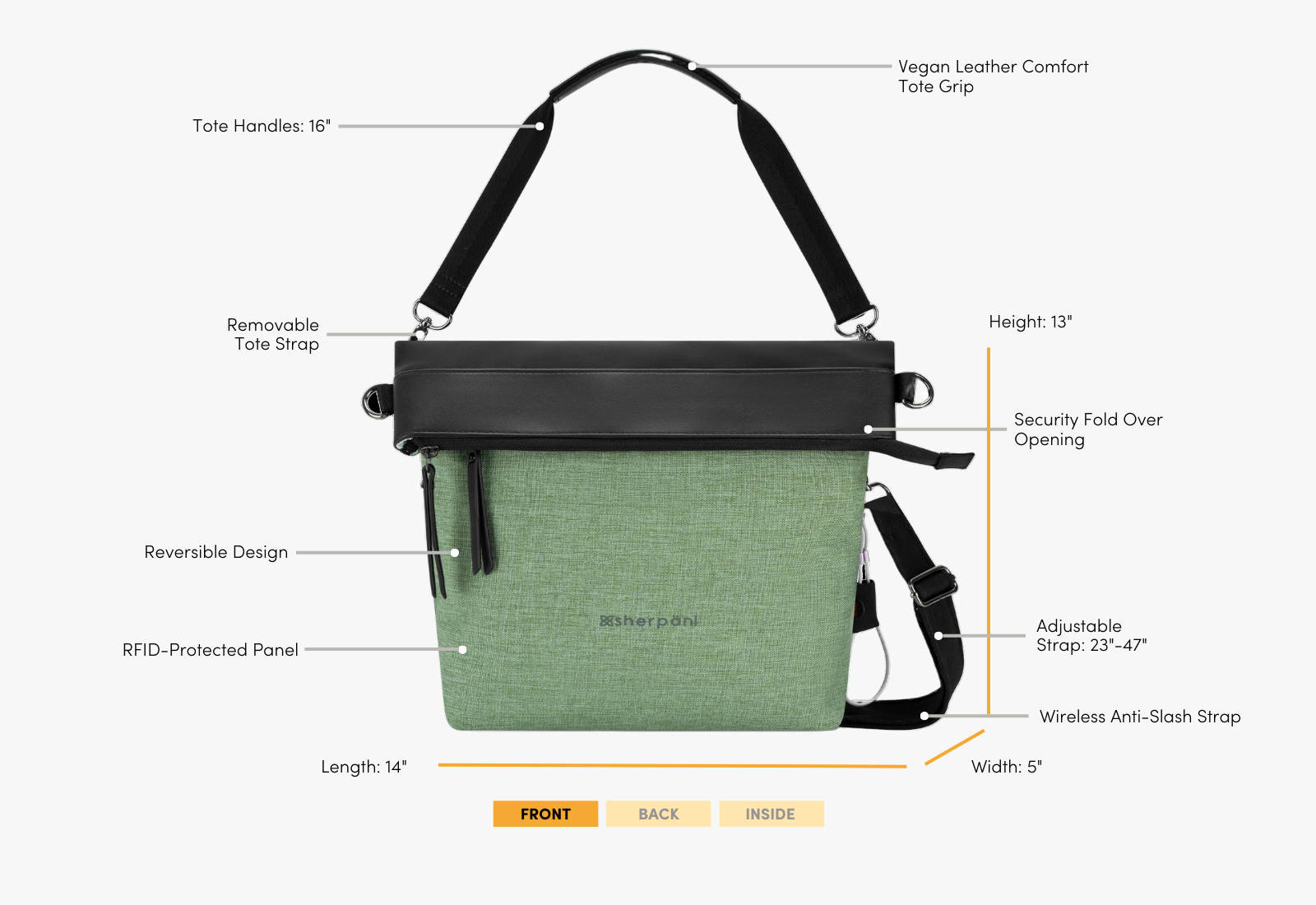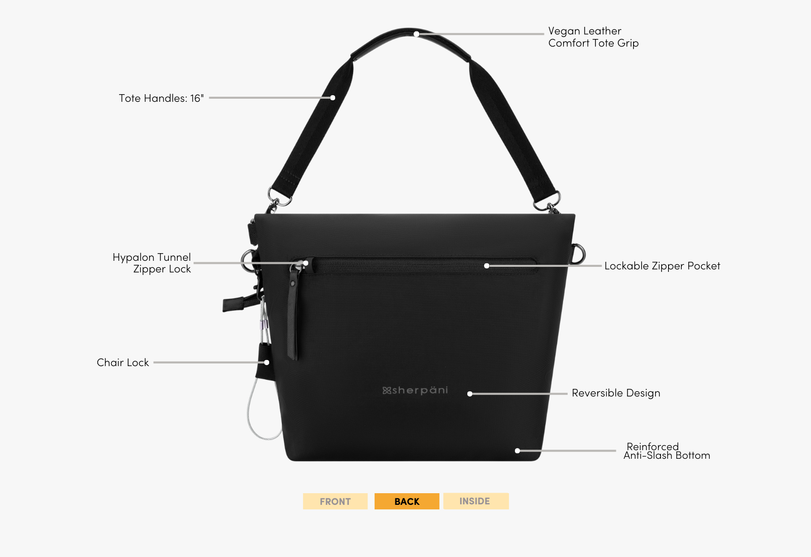 The Vale has a reversible design with two attachment points for two included strap options. There are eight different ways to style it, making it our most versatile travel bag! It doesn't get better than this do-it-all design with Sherpani anti-theft tech.
